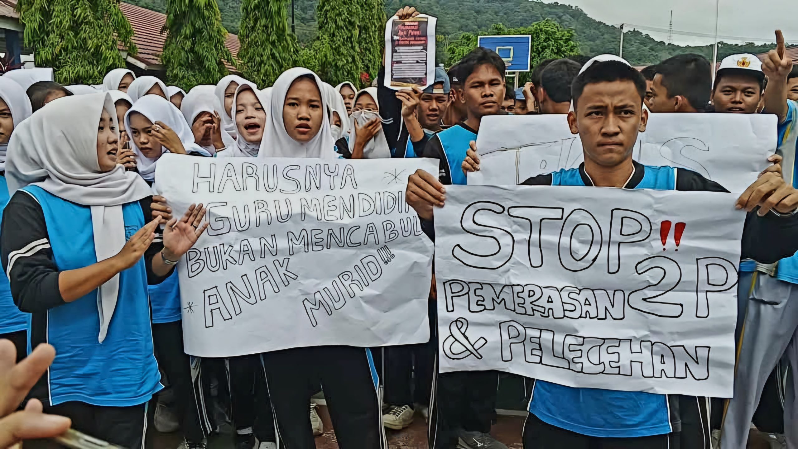 Para pelajar yang mengenakan seragam sekolah dan membawa spanduk dengan tuntutan mereka, berorasi dan menyampaikan pernyataan sikap untuk menuntut keadilan dan perlindungan dari pihak sekolah dan aparat penegak hukum.