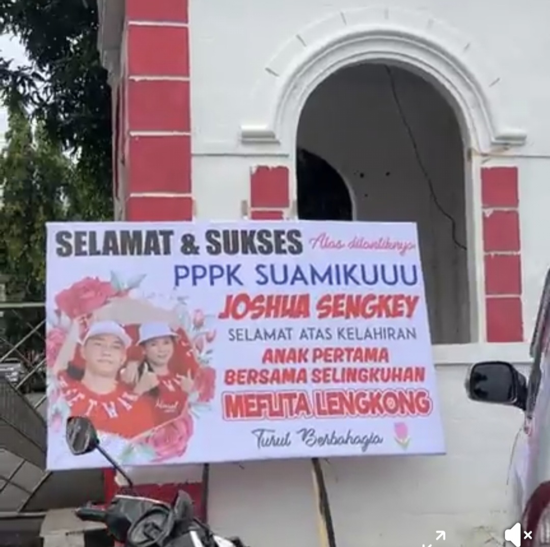 Dalam baliho tersebut tertulis ucapan selamat atas dilantiknya Joshua Sengkey sebagai P3K, disertai ucapan selamat atas kelahiran “anak pertama bersama selingkuhan”, lengkap dengan nama perempuan yang disebutkan.