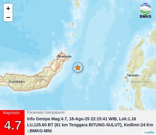 BITUNG, PRONews5.com — Gempa bumi berkekuatan magnitudo 4,7 kembali mengguncang Kota Bitung, Sulawesi Utara, Senin (18/8/2025) pukul 22.15 WIB atau 23.15 WITA.
